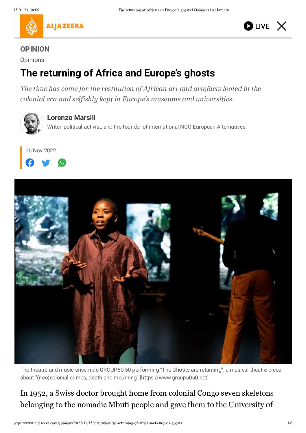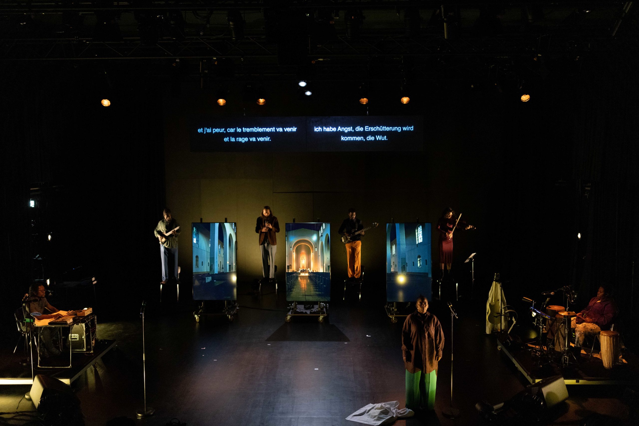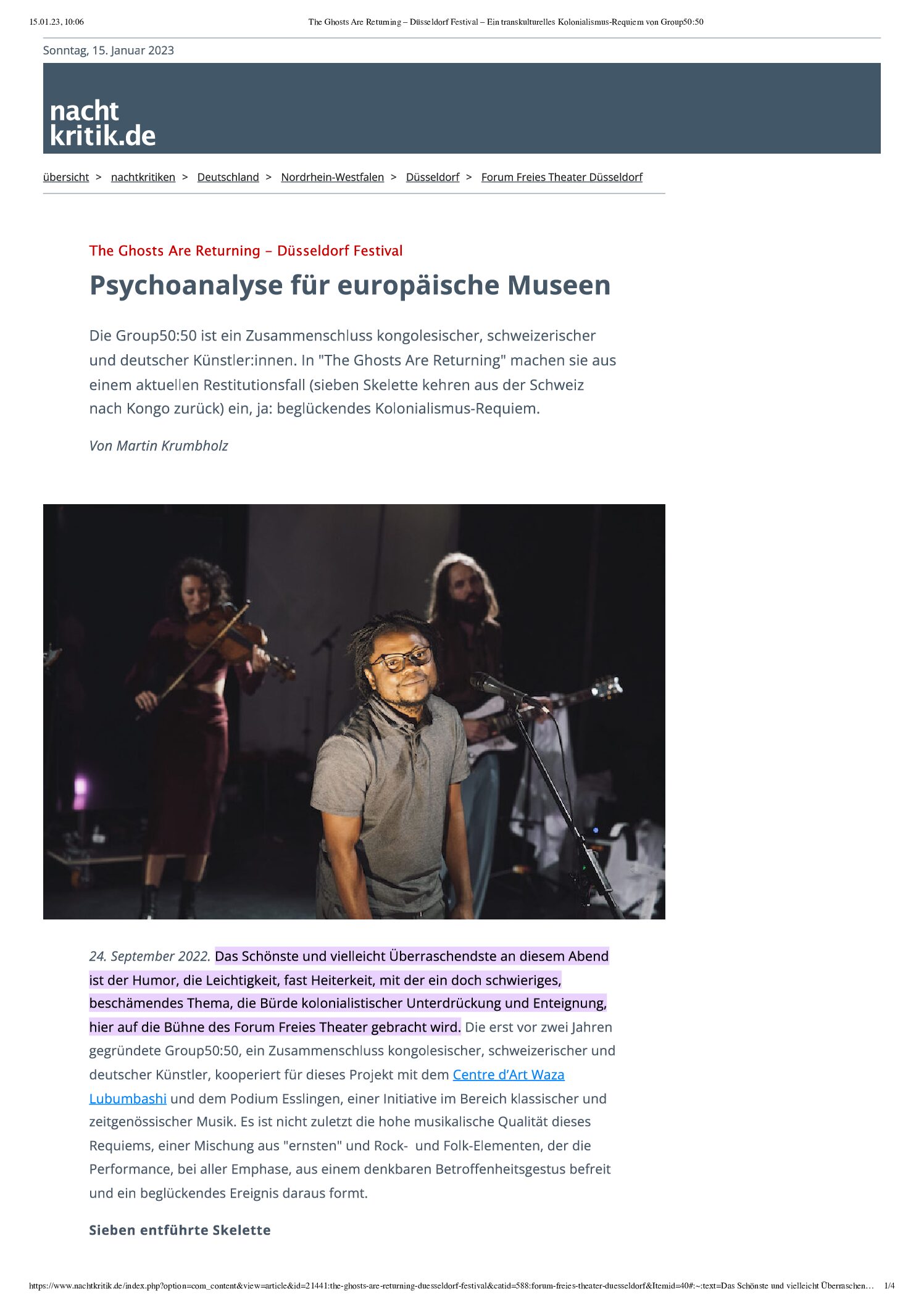 In „The Ghosts are Returning” erzählt die GROUP50:50, ein Kollektiv von Künstler*innen aus dem Kongo, der Schweiz und Deutschland die Geschichte von sieben „Pygmäen-Skeletten“, die ein Schweizer Arzt in den 50er Jahren aus dem im Kongo nach Genf brachte. Sie reisen in den äquatorialen Wald zum nomadischen Volk der Mbuti, das vom illegalen Holzeinschlag bedroht ist und aus den Wäldern vertrieben wird. Mit ihnen singend und tanzend entwickeln sie ein Ritual, mit dem die sieben Geister zu Ruhe kommen können. Es entsteht ein multimediales Musiktheaterstück über (neo-)koloniale Verbrechen, über den Tod und das Trauern.